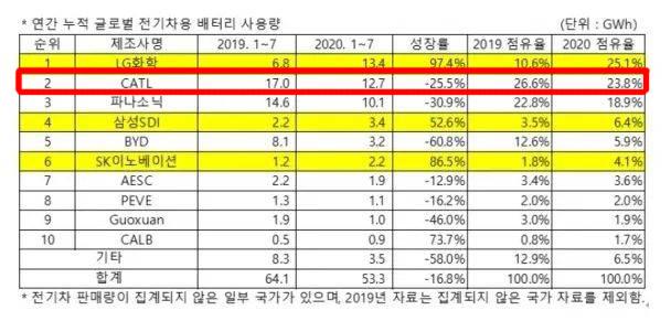韩国SNE Research发布报告,今年1-7月LG化学以13.4 GWh的动力电池装机量,占据全球25.1%的市场份额,位居第一;长期霸榜的宁德时代则以23.8%的市场份额退居全球第二。
