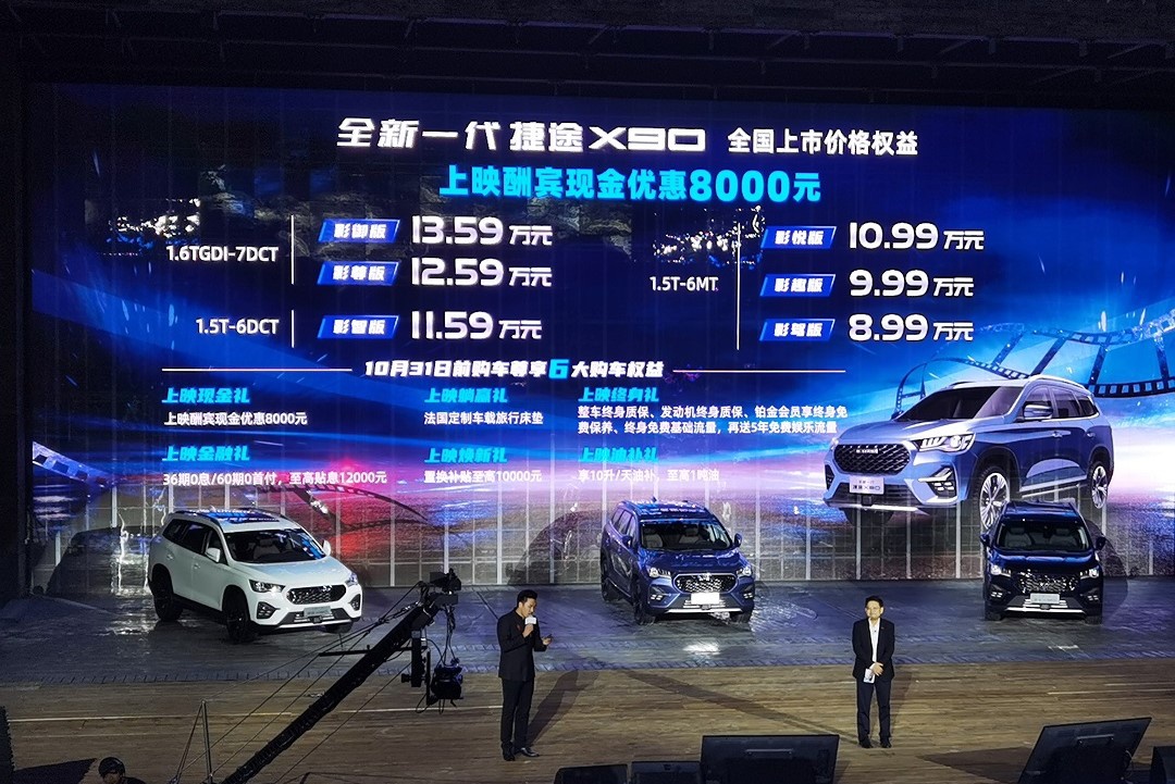 全新一代捷途X90共推出6款车型,并提供5、6、7座车型可选,指导价8.99万-13.59万元,此外,新车还推出了优惠活动,在10月31日前购车可享上映现金礼、上映躺赢礼、上映终身礼、上映金融礼、上映焕新礼、上映油补礼共6大购车权益,现在购车立享8000元优惠,仅售8.19万元起。