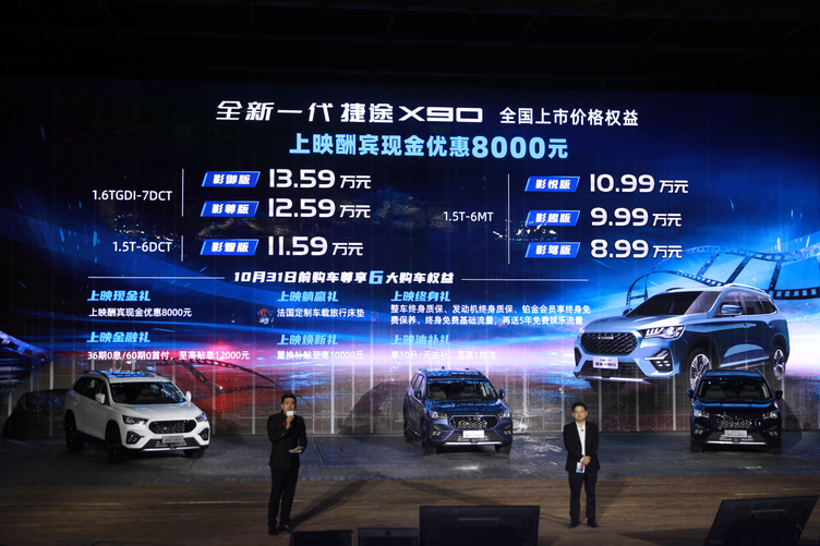 9月16日在位于北京“小江南”之称的古北水镇举行了全新一代捷途X90 (配置|询价)上市发布会,采用最新iPeL平台打造,一共推出6款配置,拥有3套动力总成,分别1.6TGDI+7DCT、1.5T+6DCT、1.5T+6MT可供消费者选择,售价区间为8.99万元至13.59万元,并提出了影院级大SUV的全新概念,同时也请来了许亚军担任新车的“艺术指导”。