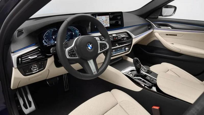 新款宝马5系并没有对内饰进行较大的调整,车机系统使用了最新的iDrive7.0,并且搭配有12.3英寸全液晶仪表盘和10.25英寸中控屏,支出触摸操作,仍然提供标准续航,无线Apple Carplay和Android Auto,更直观的菜单布局,更快的响应时间和更精美的UI设计。