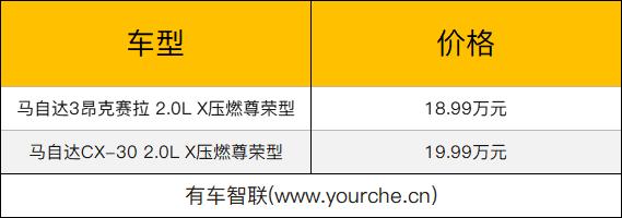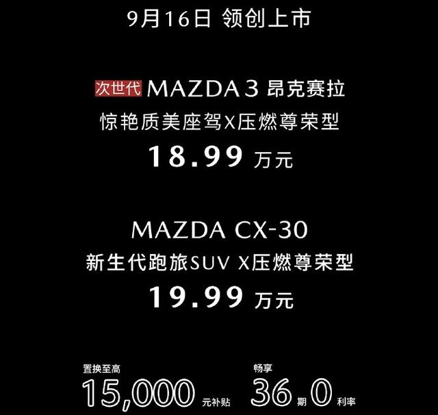 9月16日,长安马自达压燃双雄马自达3昂克赛拉 (配置|询价)和CX-30压燃版正式上市,两款新车均搭载全新创驰蓝天SKYACTIV-X 2.0L压燃发动机,指导价分别为18.99万元和19.99万元。