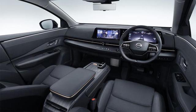 日产Ariya的中控区域十分简约,搭配贯穿式空调出风口,结合双辐式多功能平底方向盘造型,既大气又运动。新车还配有12.3英寸液晶显示屏和全液晶仪表盘,巨大的双联屏设计,科技感倍增。此外,车内黑色格调为主,搭配香槟金进行全方面的点缀,营造出轻奢氛围。