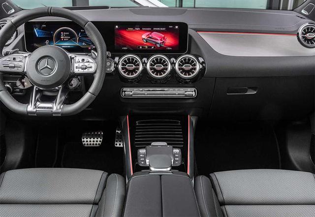 内饰部分,AMG GLA 35延续了新一代奔驰GLA (配置|询价)的设计,采用豪华大尺寸双联屏设计,搭配样式新颖的空调出风口,看上去既精致又科技。新车还配有三辐式多功能平底运动方向盘,结合多处红色线条点缀,使车内运动氛围倍增。