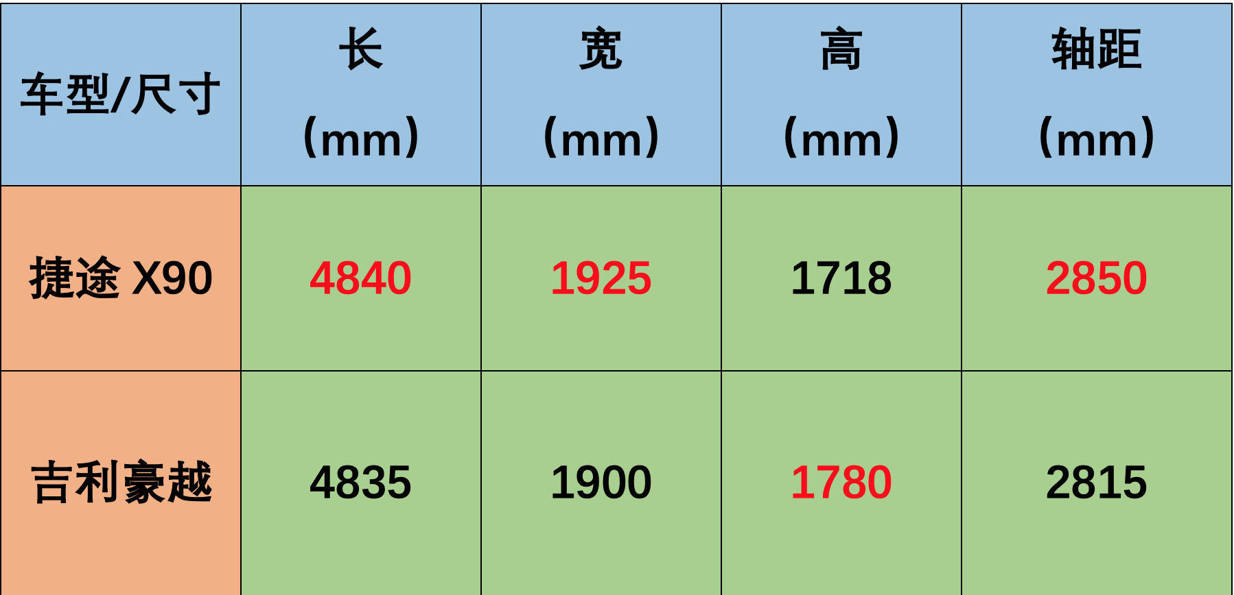 中国人一贯讲究以大为美,捷途X90定位中型尺寸SUV,车身长宽高尺寸达到了4840*1925*1718mm,轴距更是达到了2850mm。相比竞品车型吉利豪越,在车身长、宽以及轴距方面都有明显优势。