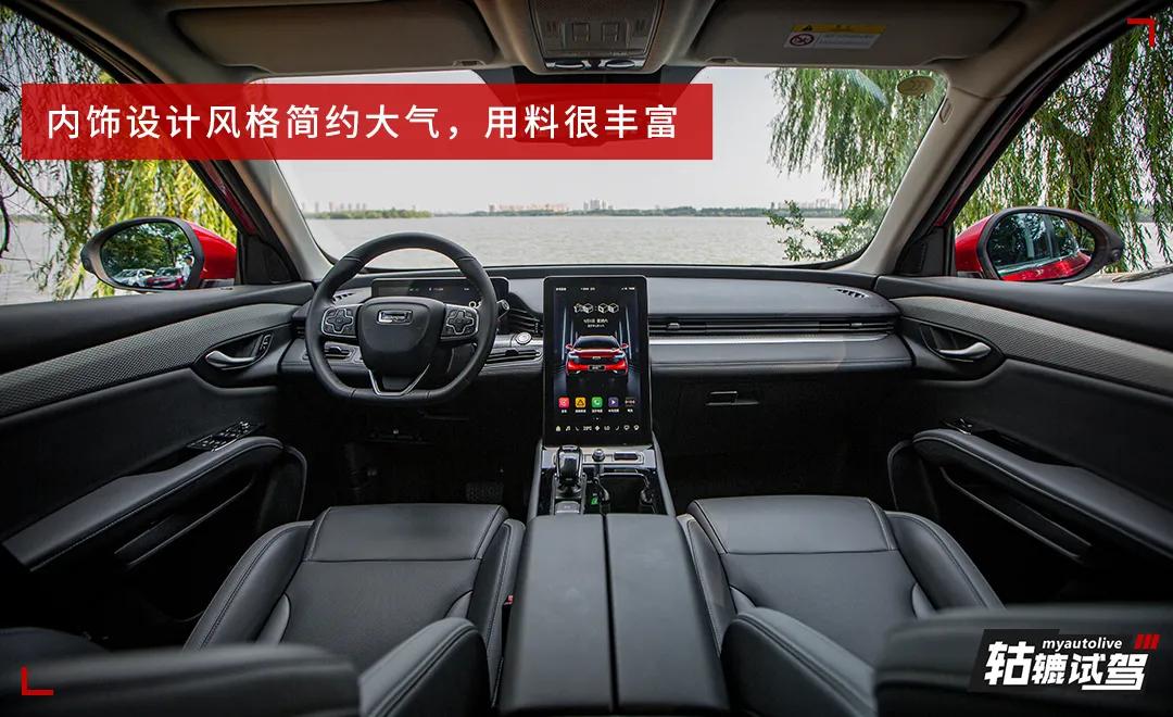 但走进车内后,也许是因为黑色配色和设计线条比较简单的原因,轱辘哥认为内饰的时尚感不如外观强烈,视觉效果处于中规中矩的水平。不过在用料方面,这款车可以说是做到越级的表现,中控台、中央扶手箱、座椅等地方都是皮革包裹,并且手摸上去也有很好的触感。