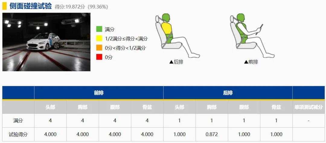 正因如此,新一代福克斯在侧面碰撞试验中取得了7项细项满分,并且得分率达到了99.36%。