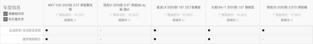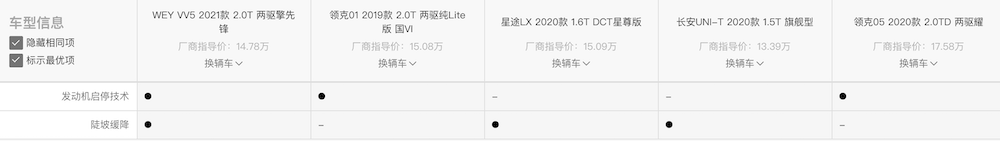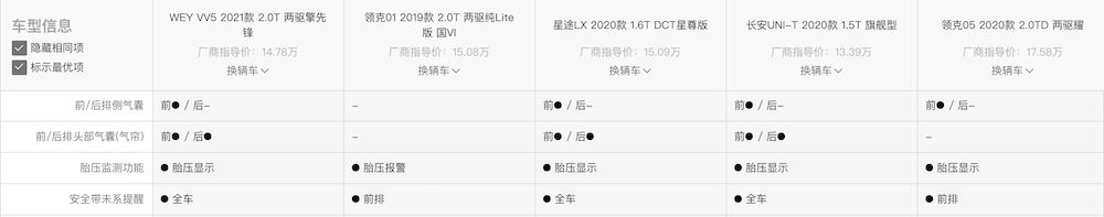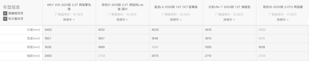 通过对比2021款VV5与其竞品车型包括(领克01、星途LX (配置|询价)、长安UNI-T (配置|询价)、领克05 (配置|询价))的参数配置表不难发现,在售价相近甚至更低的情况下,2021款VV5在核心配置上优势更加明显。