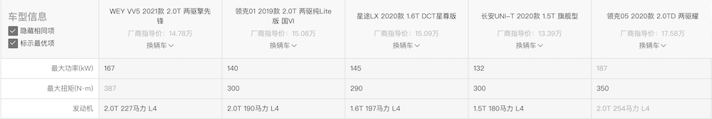 同为2.0T发动机,2021款VV5有着高达387N·m的同级最大扭矩,以及第二大的227马力。但价格稍高一点的星途LX与价格稍低的UNI-T并未提供2.0T发动机的配置。