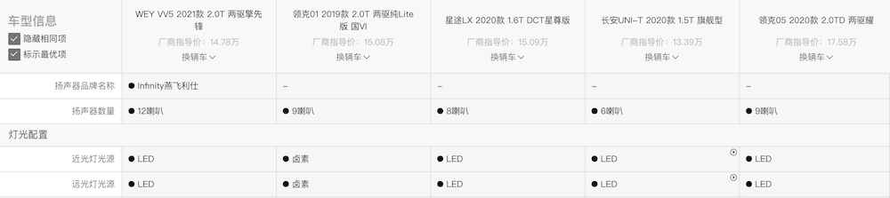 扬声器的数量、品牌,包括大灯光源,2021款VV5在这几款紧凑级SUV当中属于佼佼者,确实领克05的对比车型算不算顶配车型,但碍于售价过高,没有参考价值。