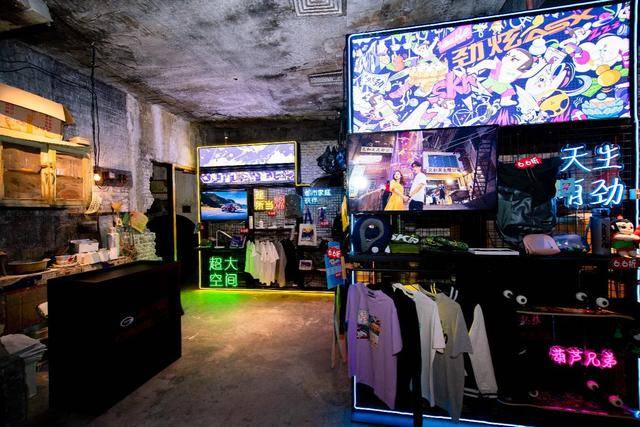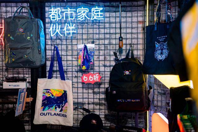 另一条霓虹装饰长廊,T恤、卫衣、镭射包、渔夫帽等等原创潮品琳琅满目……