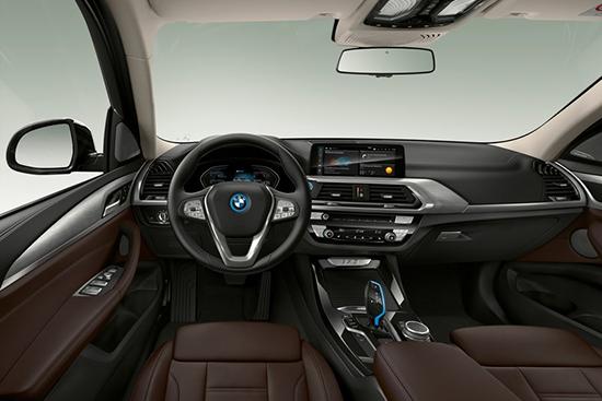 内饰方面,新车整体与宝马X3设计风格相同,仅是在细节部分进行了调整,用以突出其新能源车的身份,例如方向盘中间的宝马logo周围使用了蓝色装饰,换挡杆同样采用了蓝色饰条点缀。经典的悬浮式中控屏也使其极富科技感。