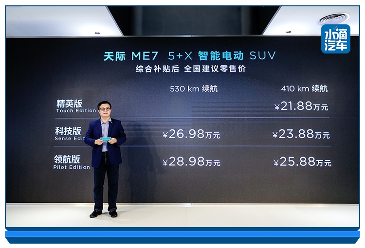 ME7推出两种续航版本共5款车型,NEDC续航分别为410km和530km,综合补贴后售价为21.88-28.98万元。