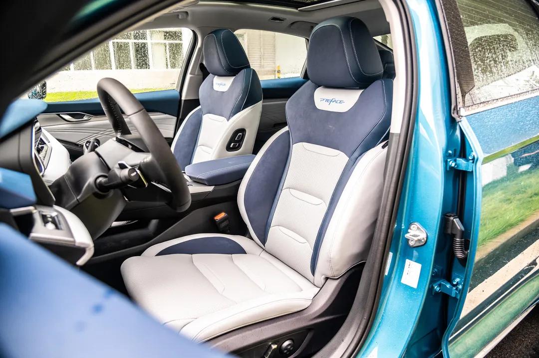 从“面”这个角度来说,PREFACE的这套内饰是比较简洁的,从前风挡下沿开始往后直至悬浮式中控屏那里可以看成是一个完整的曲面,再往下的话就是另外一层中控台,内饰搭配的颜色也是比较清新的游艇蓝和灰色配色。