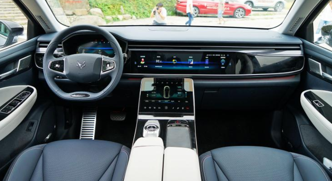来到内饰,新车采用了全新的设计语言,视觉效果更加简洁、大方。该车整体采用了环抱式驾舱设计并将中控设计的偏向于主驾驶侧,配合中控台较多的平直线条,让整体极具层次感。新车搭配有双液晶显示仪表,同时中控屏还采用了贯穿式造型,为车内营造出极高的科技感。