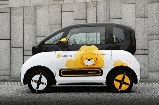 车身侧面,E300小Biu汽车采用上黑下白的布局,并融入了苏宁易购黄色元素点缀,搭配“小狮子”图案,既阳光又动感。新车还配有十字样式的轮圈,搭配前白后黄的布局,看上去活力十足。