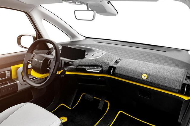 内饰方面,E300小Biu汽车融入专属黄色进行点缀,包括中控台贯穿式黄色饰条、双辐式方向盘、门板和脚垫,使车内氛围显得十分运动。新车座椅同样采用与车身外观一样的上黑下白布局,并在拼接处融入了黄色饰条,看上去非常漂亮。