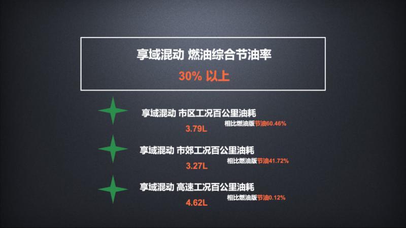 第三代i-MMD混合动力系统,通过对发动机、电机、电池的全方位升级,具有更小型、更高效、更稳定的特点,三种模式通过E-CVT变速箱实现无缝切换,动力输出稳定、线性。百公里综况油耗低至4.0L,一箱油可跑1000公里,行驶成本一公里不足0.3元。