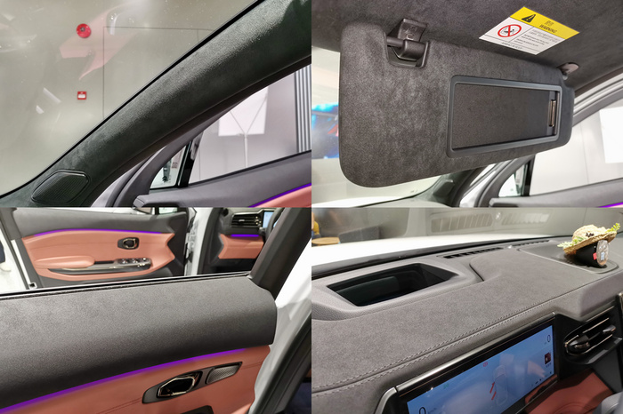 不仅如此,蔚来EC6还标配了Microfiber超纤绒顶棚,而且仪表台和门板使用了Microcloud纤云材质。这两种材质在图片上看起来有点像,但是实际上它们摸起来的手感是不一样的。Microfiber超纤绒摸上去是毛茸茸的感觉,手感比较粗糙,而Microcloud纤云材质摸上去非常顺滑,手感很细腻。两种材料的搭配很有意思,而且也大大提升了蔚来EC6的内饰质感。