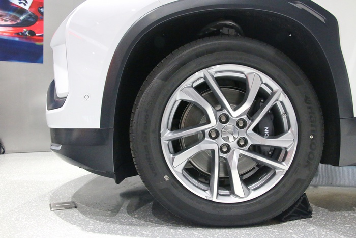 这台展车搭载了最低配的19寸轮圈,使用的轮胎是韩泰的Ventus S1 evo² SUV系列,尺寸为255/55 R19,该系列轮胎主打干湿地抓地性能,运动性能较好,舒适性一般,胎噪稍大。
