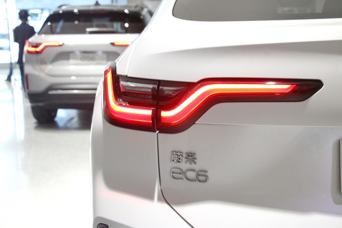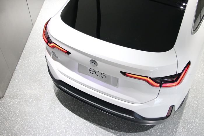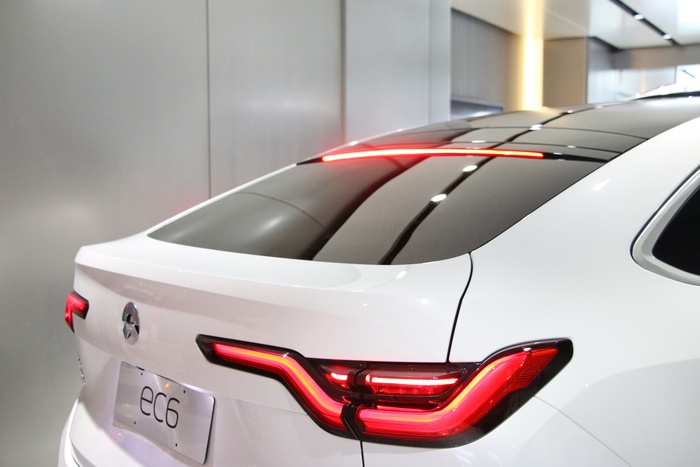 蔚来EC6的车顶和后视镜都使用与车身同色的涂装,而蔚来此前的两款车在这两个位置都使用了熏黑处理。此外,蔚来EC6使用了与新款ES8一样的天际线高位刹车灯,刹车灯的长度比一般车都要长,在车流中辨识度很高。