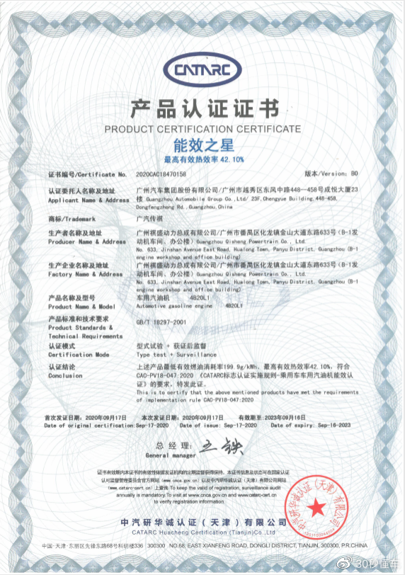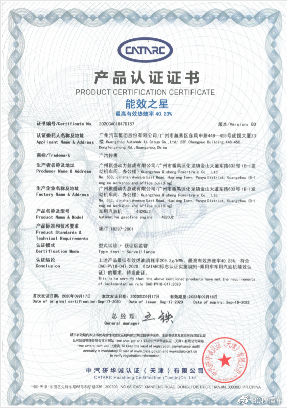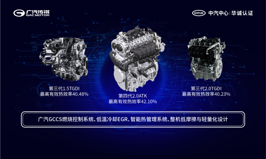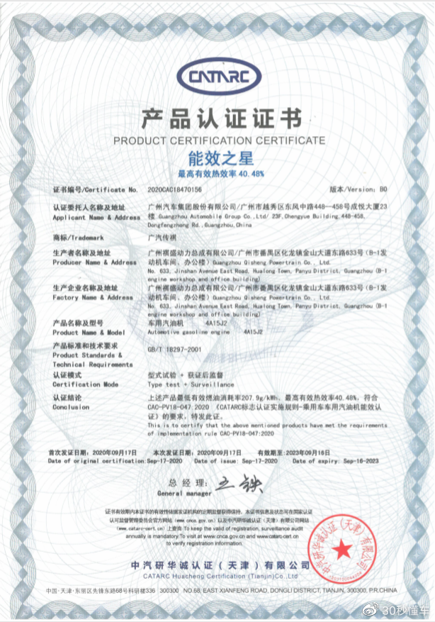 (广汽传祺第三代1.5TGDI、2.0TGDI发动机,第四代2.0ATK发动机获得华诚认证“能效之星”证书)