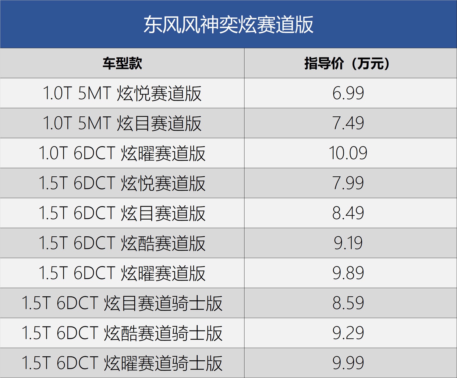 2020年9月22日,东风风神奕炫 (配置|询价)赛道版正式上市,新车共推出10款车型,售价区间为6.99-10.09万元。赛道版车型主要在中网处增加独特标识,并在轮圈处采用熏黑处理,并增加车身空气动力学套件等。