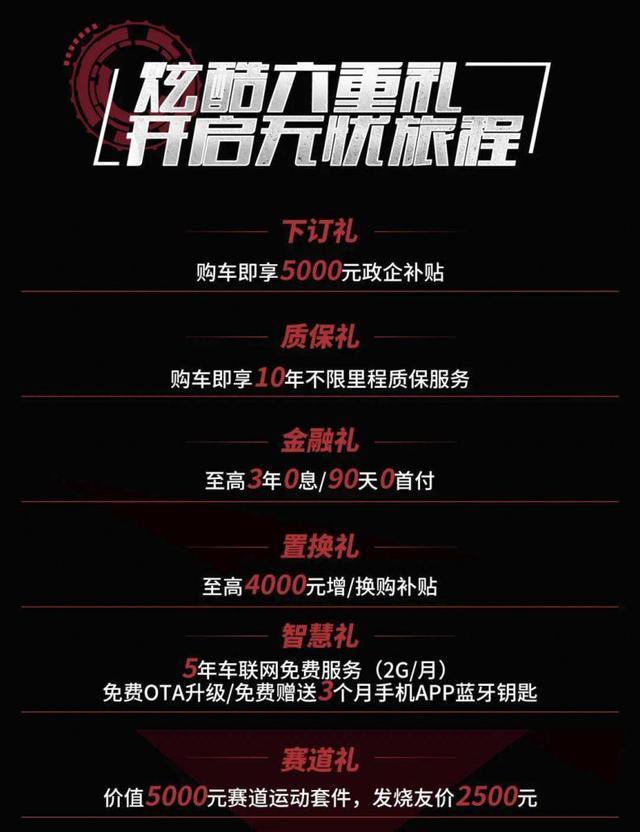 包括下订礼:购车即享5000元政企补贴;质保礼:购车即享十年不限里程质保服务;金融礼:至高3年0息/90天0首付;置换礼:至高4000元增/换购补贴等。