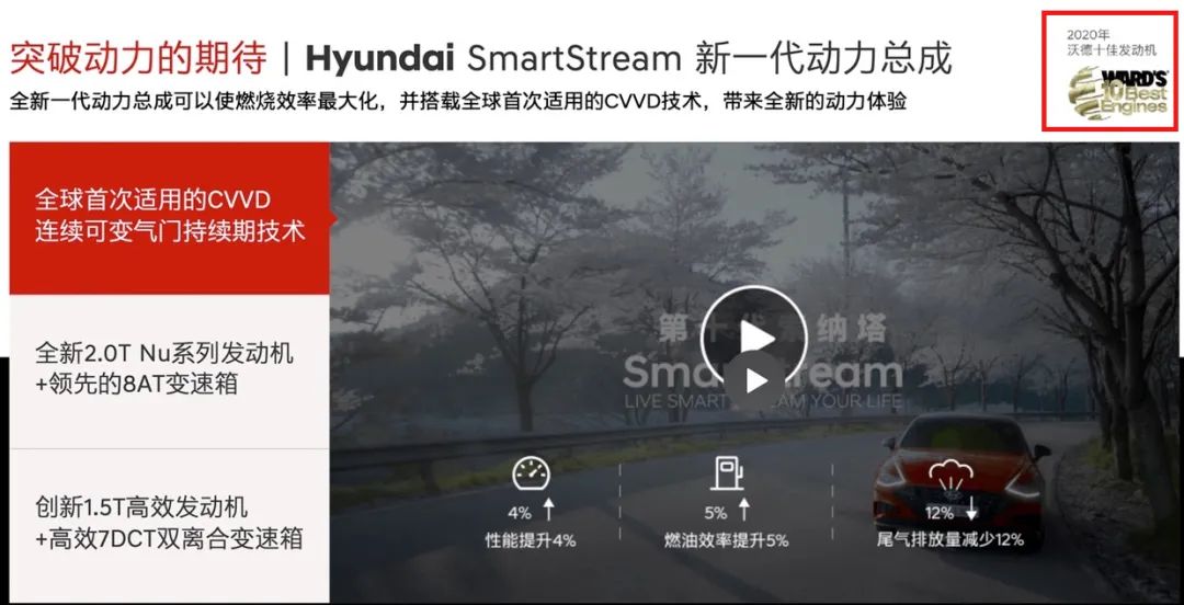 北京现代索纳塔官网上,挂有2020年沃德十佳发动机标志
