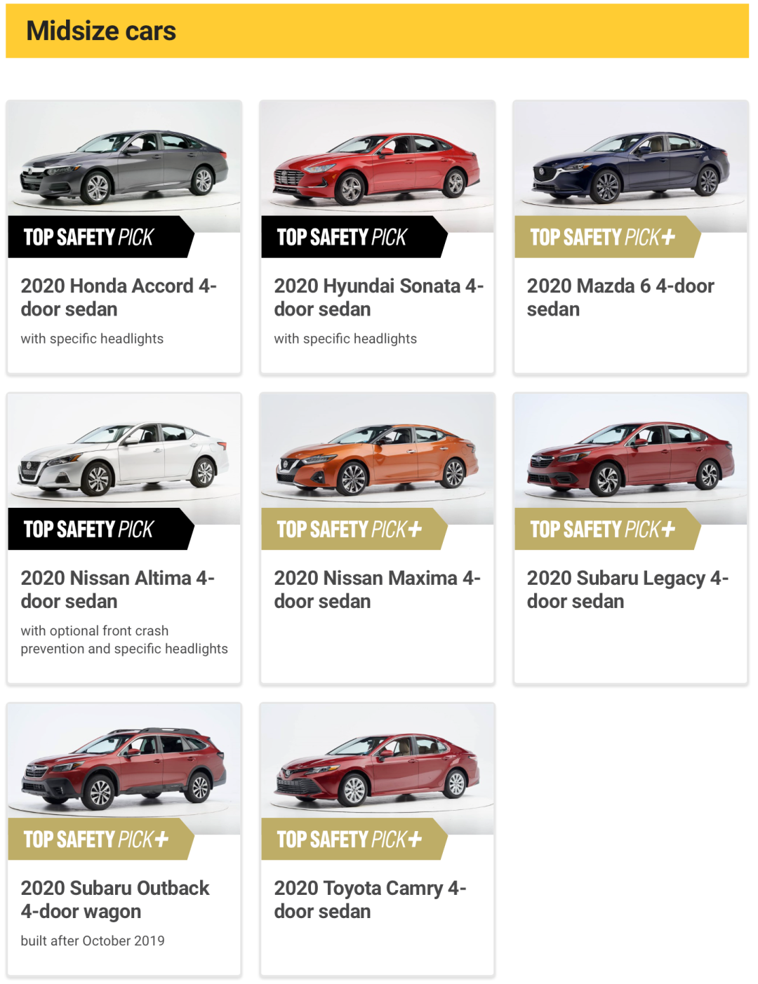 截止目前,2020年IIHS测试的8款中级车评级
