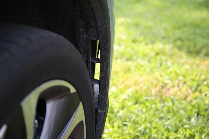 这样不但能让车底的气流更顺,降低高速时的空气阻力,降低能耗,变相增加续航里程,还能给刹车做一个通风,在一定程度上减少热衰减。