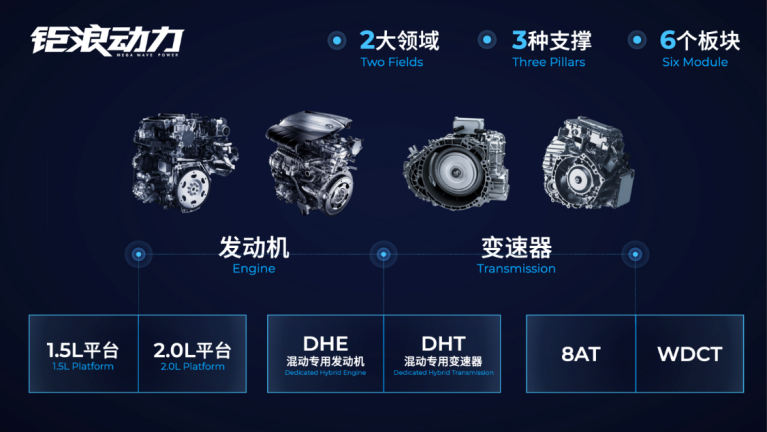 “钜浪动力”有什么产品成果呢?目前已经构建了“两大领域、三大支撑、六个板块”——即发动机、变速器两大领域;高效发动机、高效变速器、混动产品三大支撑;1.5L燃油发动机、2.0L燃油发动机、DHE混动发动机、WDCT变速器、AT变速器、DHT混动变速器六个板块完整的产品架构,具备了“动力强劲、经济耐用、环保清洁、静谧安逸、自适智控”五大核心领先优势。
