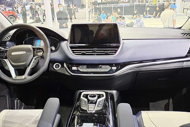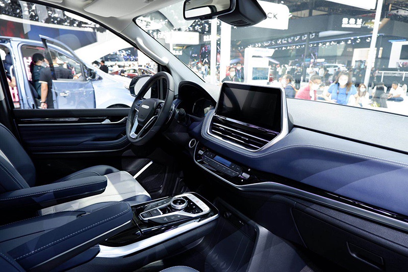 内饰方面,EUNIQ 7采用了与燃油车相同的内饰设计,整体大量运用了富有质感的深蓝色用料,并在细节部分加以银色点缀。新车配备了三辐式多功能方向盘和悬浮式中控屏,中部空调出风口采用了连贯式设计,给新车内饰增加了一定的科技感。EUNIQ 7换挡区域采用了多功能按键的设计,加强了驾驶人员的操作感。
