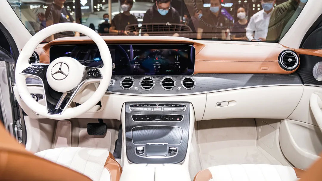 在看过S级的竖向大屏内饰之后,重新回顾E级的贯穿双联屏,反而有一种更加优雅的感受。新款E级换用了全新设计的方向盘,线条更具张力。