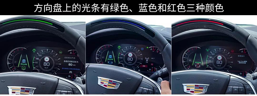 使用Super Cruise超级智能驾驶系统过程中,方向盘上的光条还会通过绿色、蓝色和红色三种颜色来直观地告诉驾驶员当前车辆的状态,其中,绿色表示车辆的行驶状态安全,蓝色则在车辆变道时显示,红色意味着当前的车辆行驶状态比较危险。