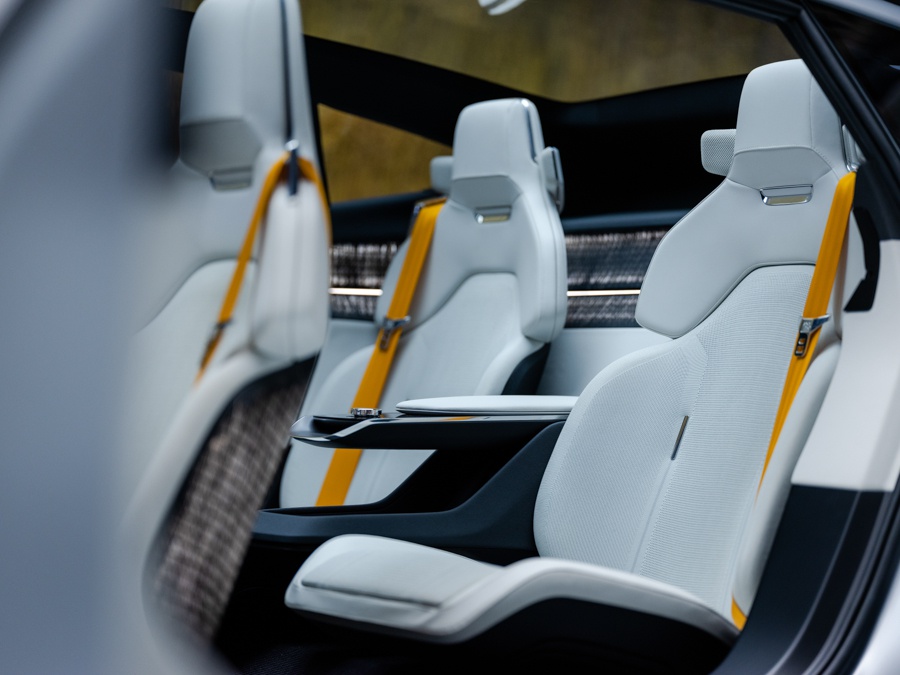 作为一个致力于可持续发展的品牌,极星Precept的内饰不仅采用了大量多种创新环保的可回收材料,包括PET塑料瓶、渔网和软木纤维等等,还采用了与Bcomp公司合作开发的天然亚麻纤维复合材料代替塑料,应用于车内的内饰面板和座椅背板。这些新型环保材料的应用在让车内饰板重量减少50%的同时,还通过特殊的加固工艺,提升了250%的抗振动效果,从而降低碰撞时的伤害。