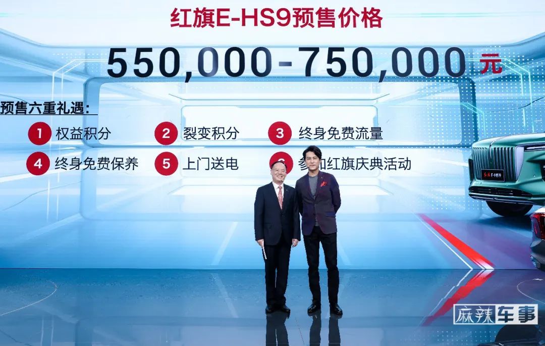 为了回馈消费者,在当天发布会上,红旗品牌也发布了“预售六重礼遇”,预定客户将享有首任车主终身免费流量、首任车主终身免费保养、上门送电等服务。