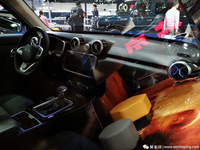 内饰则出现了北京惯用的炮筒式空调出风口设计,辨识度很高。中央出风口下方是尺寸较大的宽屏,目前车还未能打开车门和通电,我们无法得知其使用体验和显示效果如何。可以通过玻璃看到车内使用了较多的软质材料包裹,包括搪塑、皮质,座椅也采用皮质包裹,档次感还是有的。