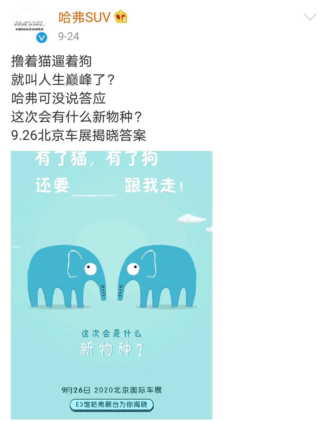 “有了猫,有了狗,还要()跟我走!”这是北京车展前夕,长城哈弗官方发布的一则新车预热海报上的内容。同时,官微还配上了一段文字:“撸着猫遛着狗,就叫人生巅峰了?哈弗可没说答应,这次会有什么新物种?9.26北京车展揭晓答案。”