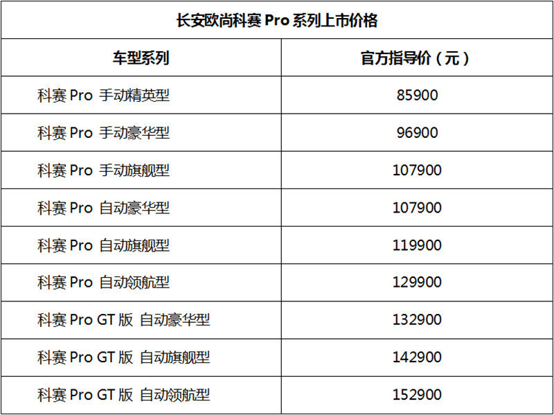 2020年9月28日,长安欧尚汽车旗下全新中大型旗舰SUV——长安欧尚科赛Pro正式发布上市。新车定位为“中国大家庭出行大7座SUV”,共推出科赛Pro与科赛Pro GT版2个序列9款车型,售价区间8.59-15.29万元。