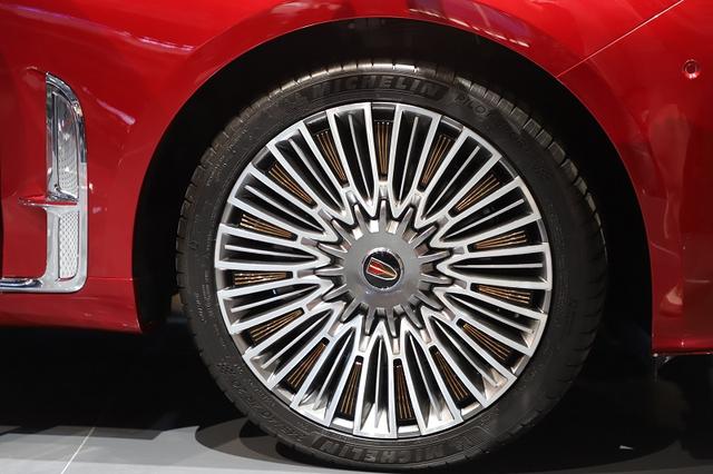 通过直观对比可以发现,展车明显比现款红旗H9长了很多,而事实也确实如此,新车的车长5340mm,轴距比超过普通版车型长了200mm,为3260mm。为掩饰加长后的痕迹,新车对B柱进行了全新设计,镀铬装饰变得更为粗壮,并加入了特殊的LOGO以示不同。