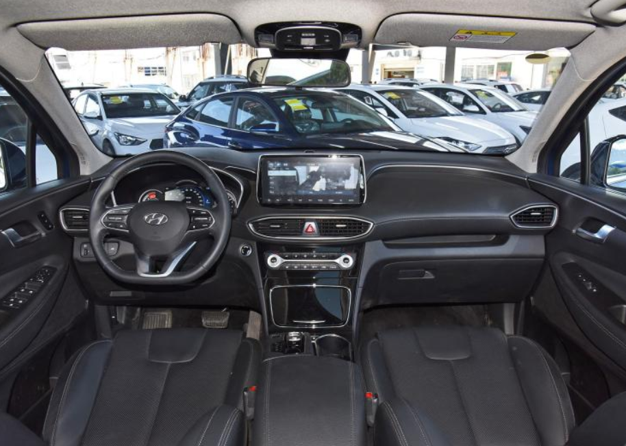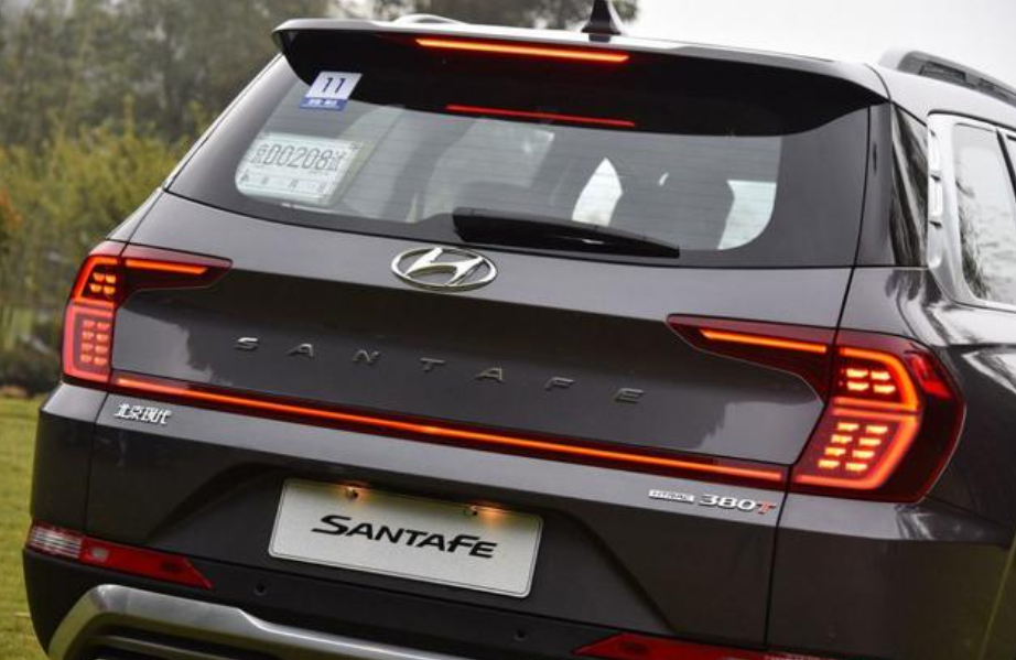 车身侧面,侧面造型比较魁梧,营造出了悬浮车顶的设计效果,时尚感表现不错。同时,粗壮的黑色轮眉以及侧裙部分的黑色装饰条也为新车增加了一些硬派气息。尾部方面,尾部造型科技感十足,贯穿式尾灯设计与两侧点阵式尾灯紧密相连。SANTAFE车型标识坐落于尾部中央部分,尾部整体比例协调有致,豪华大气。此外,车尾采用双边共两出的排气布局,提升了车尾的运动感。
