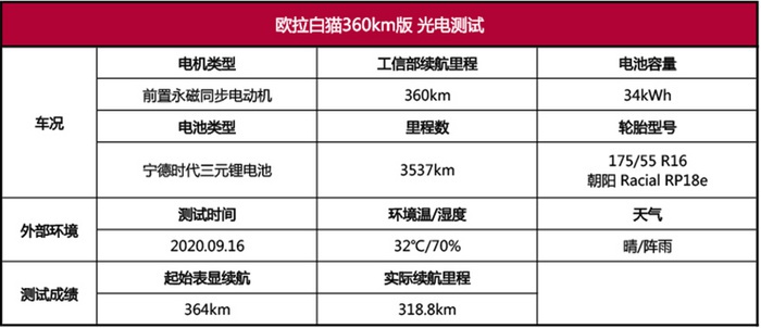 随着天色已晚,在白猫不显示剩余续航历程后,整整又跑了63.2km,我们期盼已久的小乌龟标志才正式亮起。乌龟标志出现后,白猫的动力终于有了明显的衰减,随后我们又行驶了4.7km,这台NEDC 360km的白猫才正式趴窝,停在了充电桩前。最终,做出了318.8km的续航成绩,占NEDC续航的88.56%。