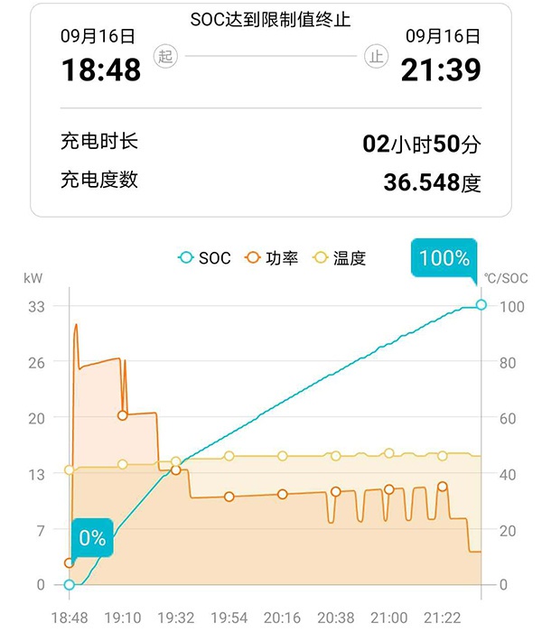 在前40分钟,白猫的直流快充桩上的充电功率比较快,这段时间内完成了0到45%的充电,这已经满足应急充一充就回家慢充的使用场景。只不过视乎于欧拉白猫只有34千瓦时的电池包,这样的快充时间算不上短。而后充电功率一度降到30kW,使得从百分之45%充到100%用了可怕的1个小时50分钟。所以建议各位充得差不多就回家慢充吧,没必要在快充桩浪费时间。