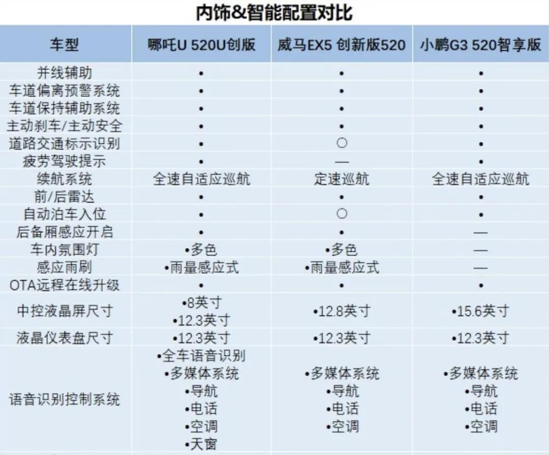 纵观其他造车新势力的车型,它们也有着自身独有安全配,整体上也有着出色表现。我们选取了市场上热度较高的威马EX5-Z和小鹏G3与哪吒U进行了对比,