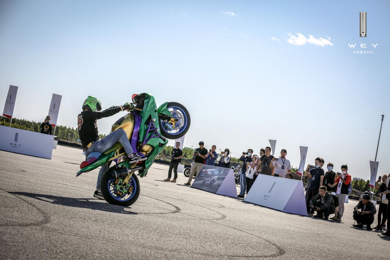 此次活动,由众多车友组成的机车队伍,特意从北京赶来为坦克300助阵,亦为坦克300开放日增加了一抹靓丽的风景线。精彩机车文化秀,“对向翘头”、“双车漂移”、“前轮滑”、“单飞燕”等一系列行云流水的机车特技表演,让现场嘉宾内心澎湃不已,渴望亲身一试,而这正是机车的魅力所在,更是越野的魅力所在。
