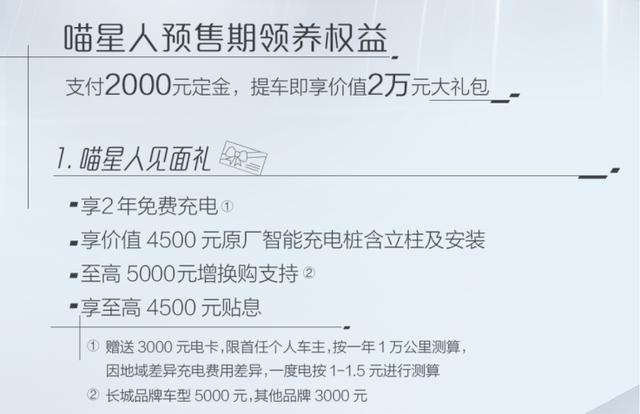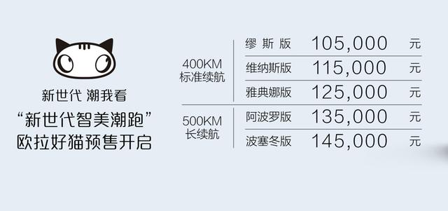 9月27日,欧拉好猫 (配置|询价)在北京车展正式开启预订,预售价为10.5万-14.5万元。在9月27日-10月31日期间,线下支付2000元定金,提车即享价值20000元豪华大礼包,包含2年免费充电、至高5000元换购补贴、至高4500元贴息、价值4500的原厂智能充电桩等专属好礼。