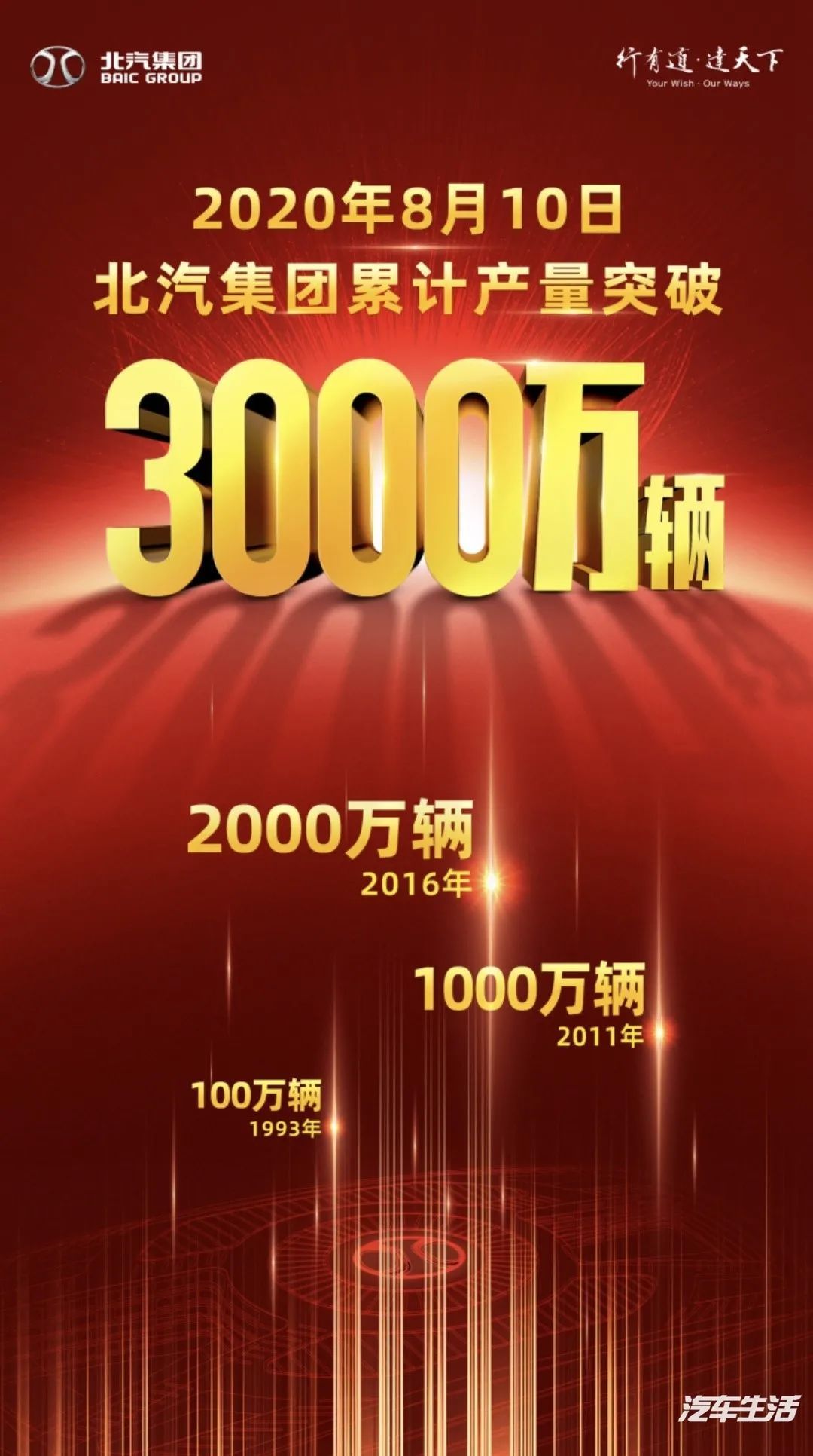 2020年8月10日,北汽集团的累计产量已然突破了3000万辆大关。从0到100万辆,北汽用了35年;从100万辆到1000万辆,北汽用了18年;从1000万辆到2000万辆,北汽用了5年;从2000万辆到3000万辆,北汽仅用了4年。