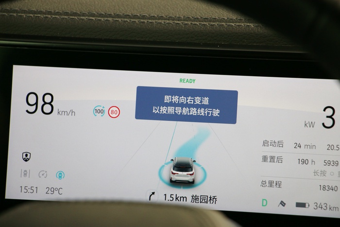 在满足条件的路段,按下方向盘左侧的蓝色按键,蔚来的NOP就会启动,仪表上会有相应的文字提示,并且仪表中车辆两侧的车道线会汇聚成一条,此时车辆会将当前道路的最高限速设定为巡航车速,并且在行驶过程中会根据道路限速变化自动调整巡航车速。当然,驾驶员也可以通过方向盘左侧的按键手动调整限速。