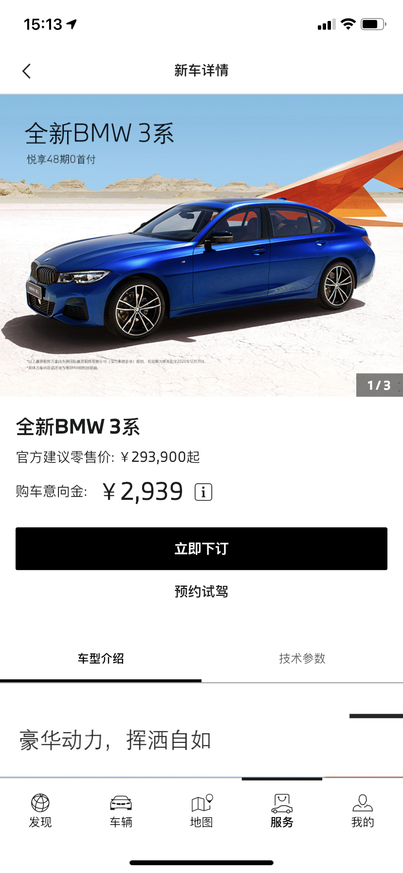 比如轱辘哥尝试通过新车商城查看感兴趣的全新宝马3系 (配置|询价),点开页面可看到官方零售价29.39万起,还有车型介绍和技术参数等信息。如果选择立即下定,需要选择经销商,留下联系方式,以及支付2939元购车意向金。
