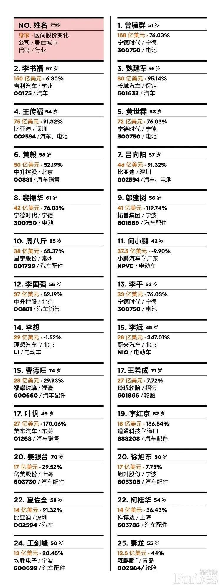 中国汽车产业首富是来自于宁德时代的曾毓群,财富值达158亿美元,超越了曾经连续3年夺得首富的李书福。同时宁德时代还有三位富豪上榜,财富值都超30亿美元。